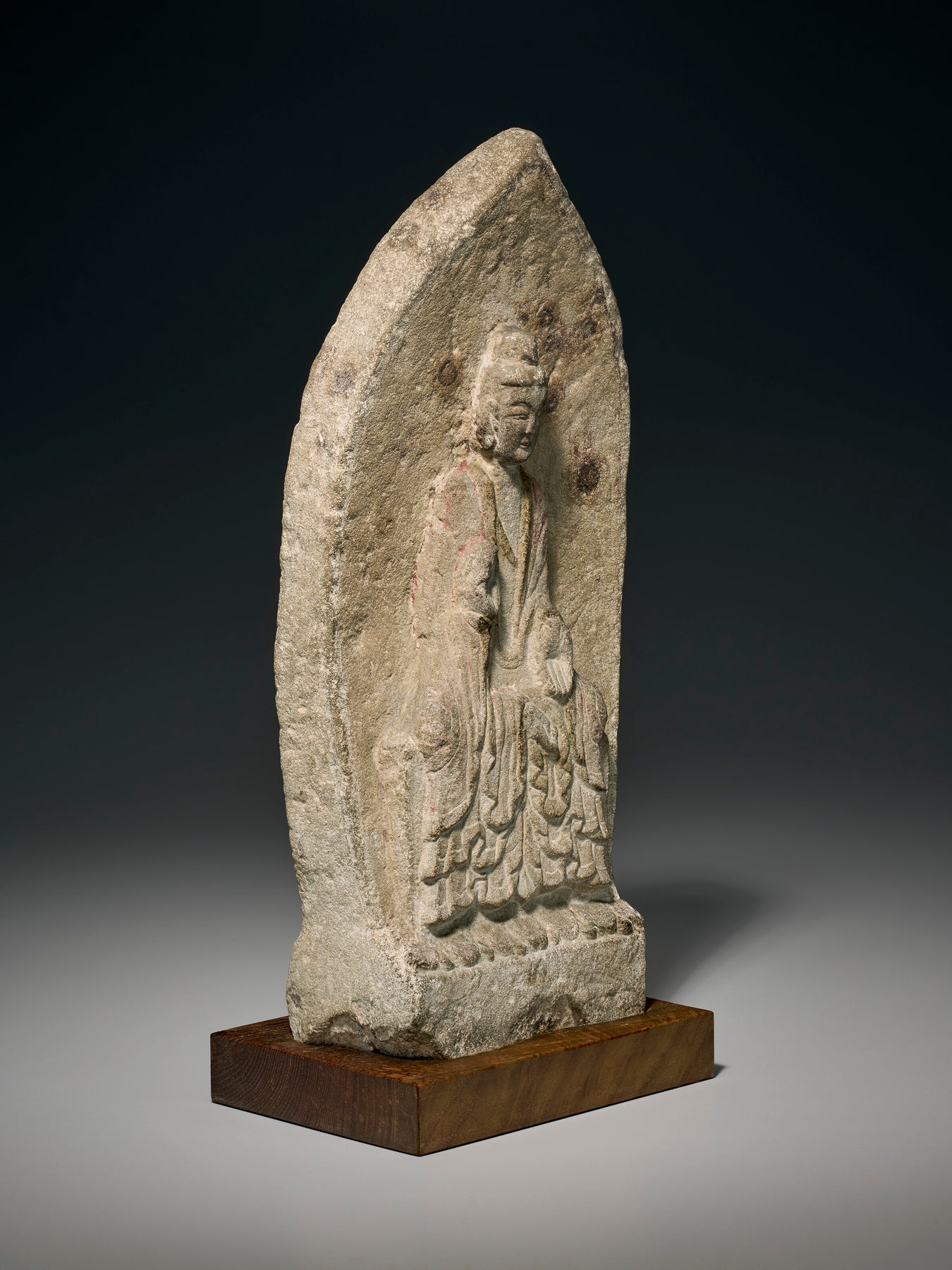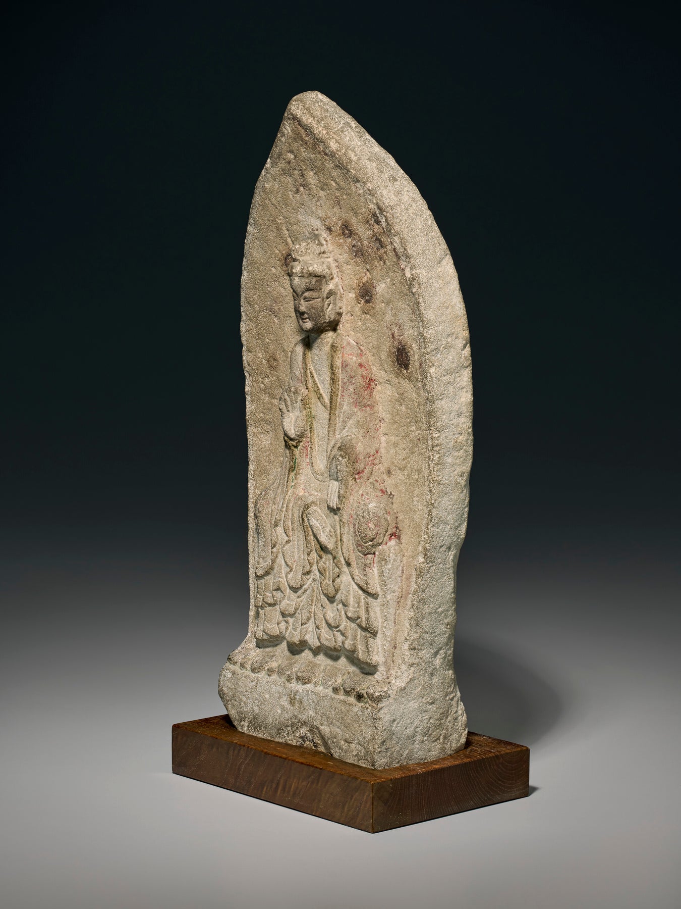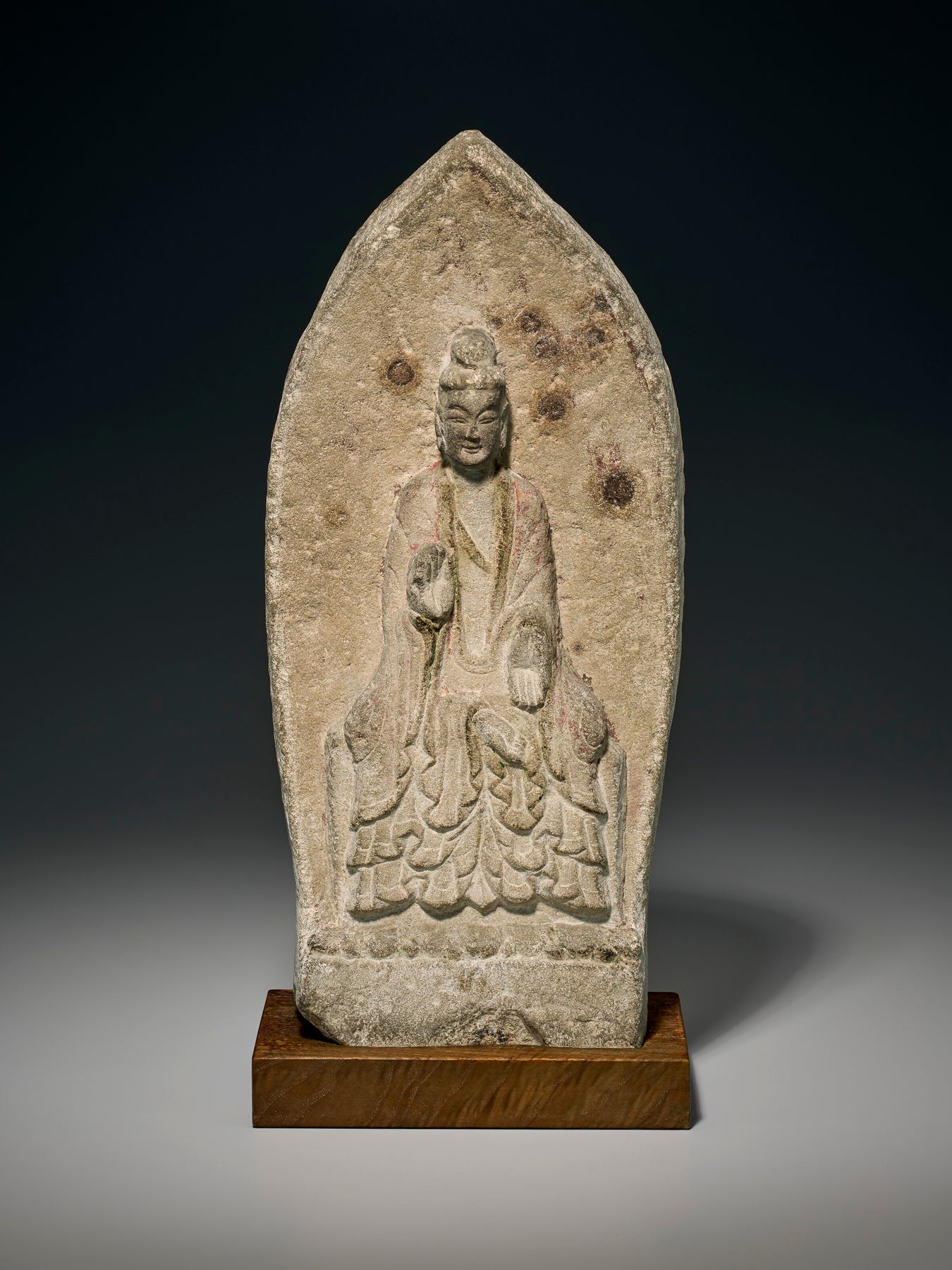 The distinctive treatment of the drapery that cascades over the dais in a symmetrical, wave-like patten can be found on other Buddha figures of Northern Wei date, such as the stone example illustrated by S. Matsubara, Chuugoku bukkyo chokokushi ron (The Path of Chinese Buddhist Sculpture), vol. 1, Early Six Dynasties, Tokyo, 1955, no. 179, and the gilt-bronze example inscribed with a date corresponding to 508 sold at Christie’s New York, 24 March 2004, lot 73.